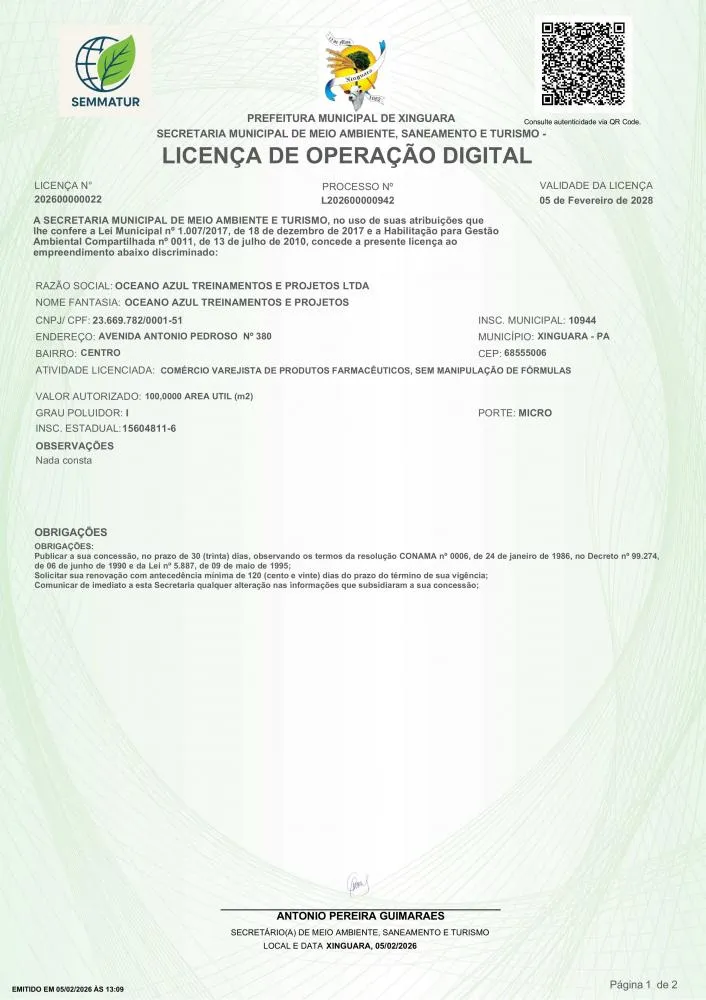 Xinguara, PA – A Secretaria Municipal de Meio Ambiente, Saneamento e Turismo (SEMMATUR) oficializou, no último dia 05 de fevereiro de 2026, a concessão da Licença de Operação Digital nº 202600000022 para a empresa Oceano Azul Treinamentos e Projetos LTDA.