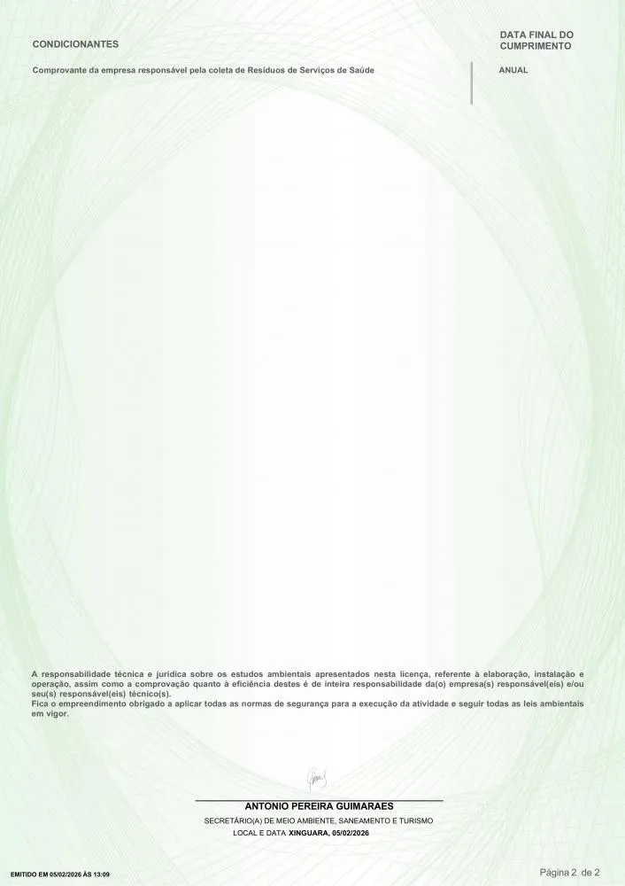 A licença, assinada pelo Secretário Antonio Pereira Guimarães, possui validade até o dia 05 de fevereiro de 2028.